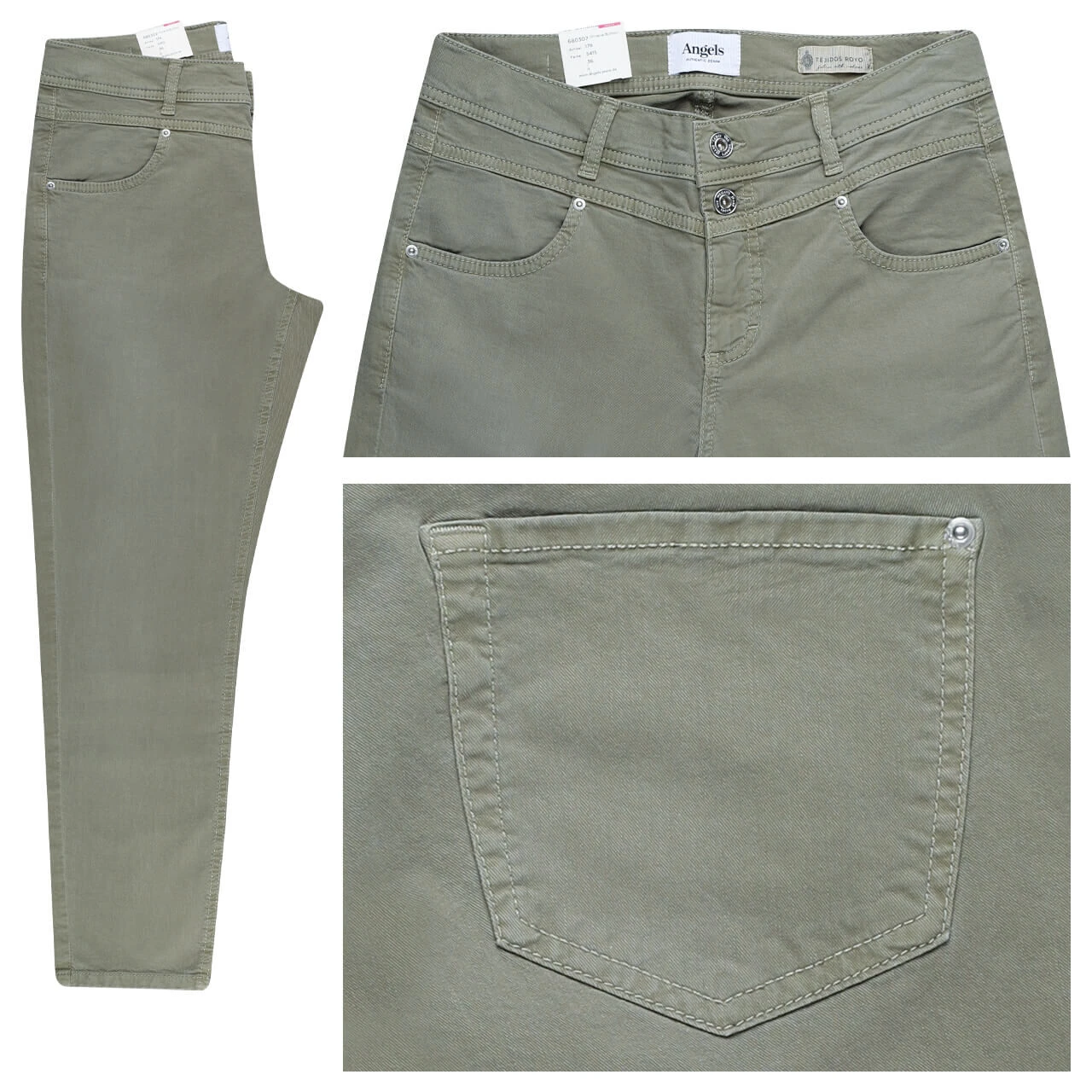 Die Angels Ornella überzeugt auf ganzer Linie! Zwei Verschlussknöpfe und Nieten in Silber verleihen der Damenjeans eine hochwertige Optik. Der Olivton und die 7/8-Länge geben der stretchigen Ornella zudem einen modernen Look.