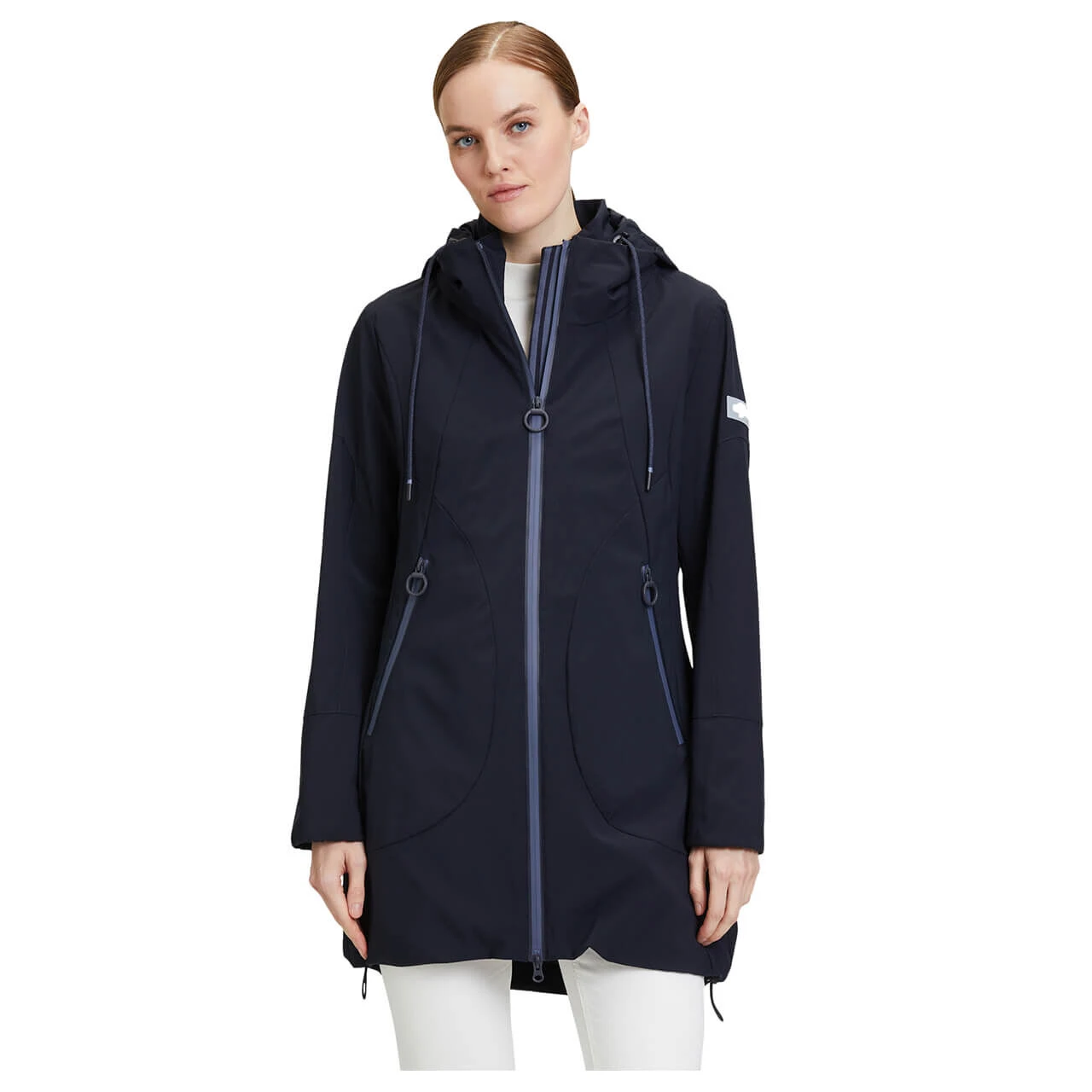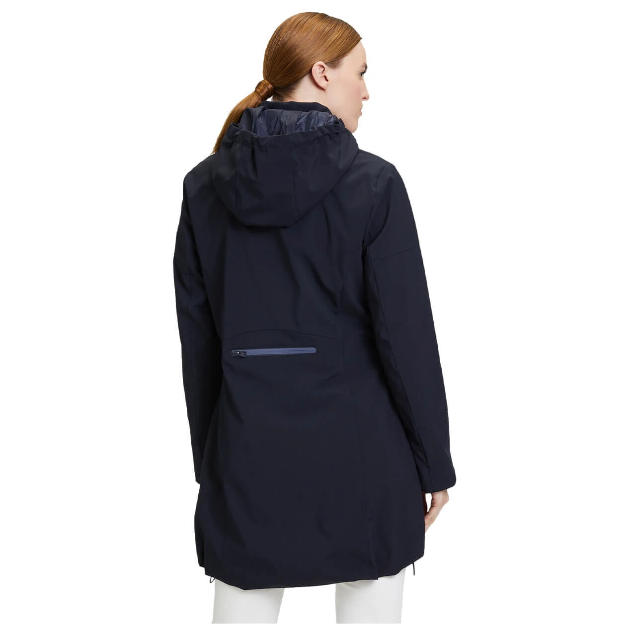 Die Übergangszeit kann noch so regnerisch und stürmisch sein, die Damenjacke von Betty Barclay steht Ihnen bei. Das wetterfeste Obermaterial und die Gummilippen an den Reißverschlüssen verhindern ungewollte Nässe. Die Kapuze ist in den Stehkragen der Jacke integriert: Sowohl vor als auch hinter der Kopfbedeckung haben Sie also einen Kragen, der Sie warmhält. Ziernähte auf dem eleganten Dunkelblau betonen den leicht taillierten Schnitt der Übergangsjacke. Eine Überraschung wartet auf der Rückseite: Dort hat sich eine vierte Tasche mit Zipper angesiedelt.