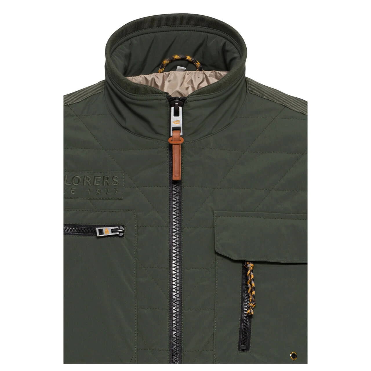Taschen über Taschen finden Sie bei dieser Camel active Herrenjacke! Zwei Stück verbergen sich auf der Innenseite, eine finden Sie am Arm, drei auf der Brust und zwei an der Hüfte. Die gelben Details, die Sie zum Beispiel an den Zippern finden, sind ein Markenzeichen des Labels. Die gesteppte Übergangsjacke mit Rippbund am Stehkragen hat insgesamt eine sportive, kernige Optik.