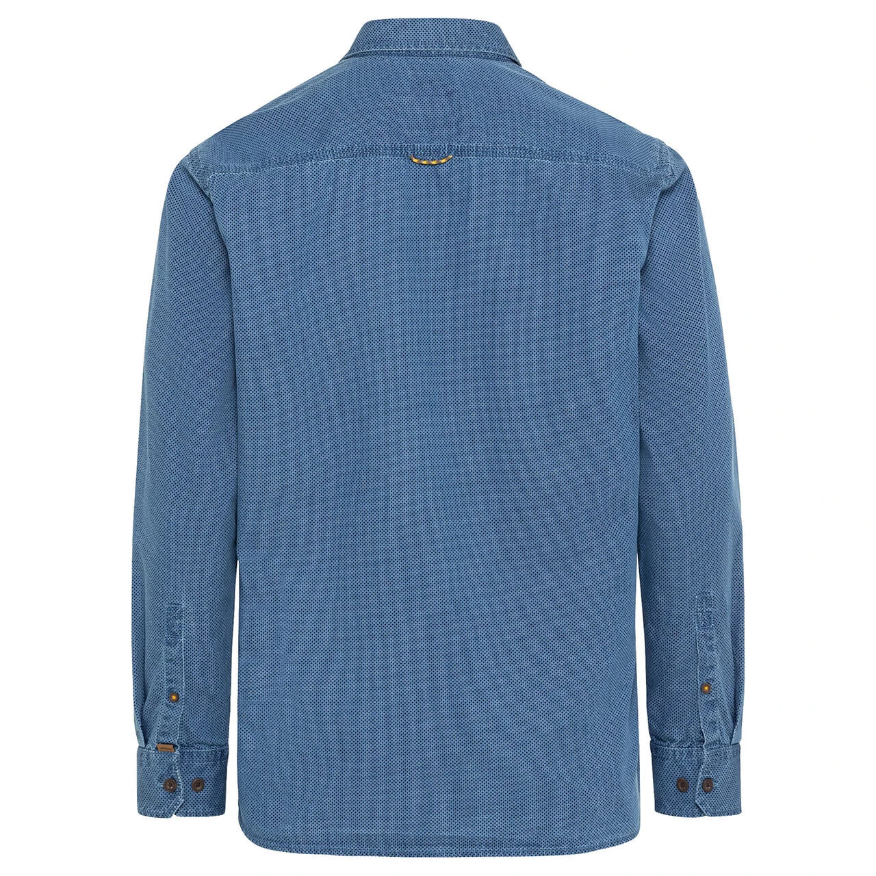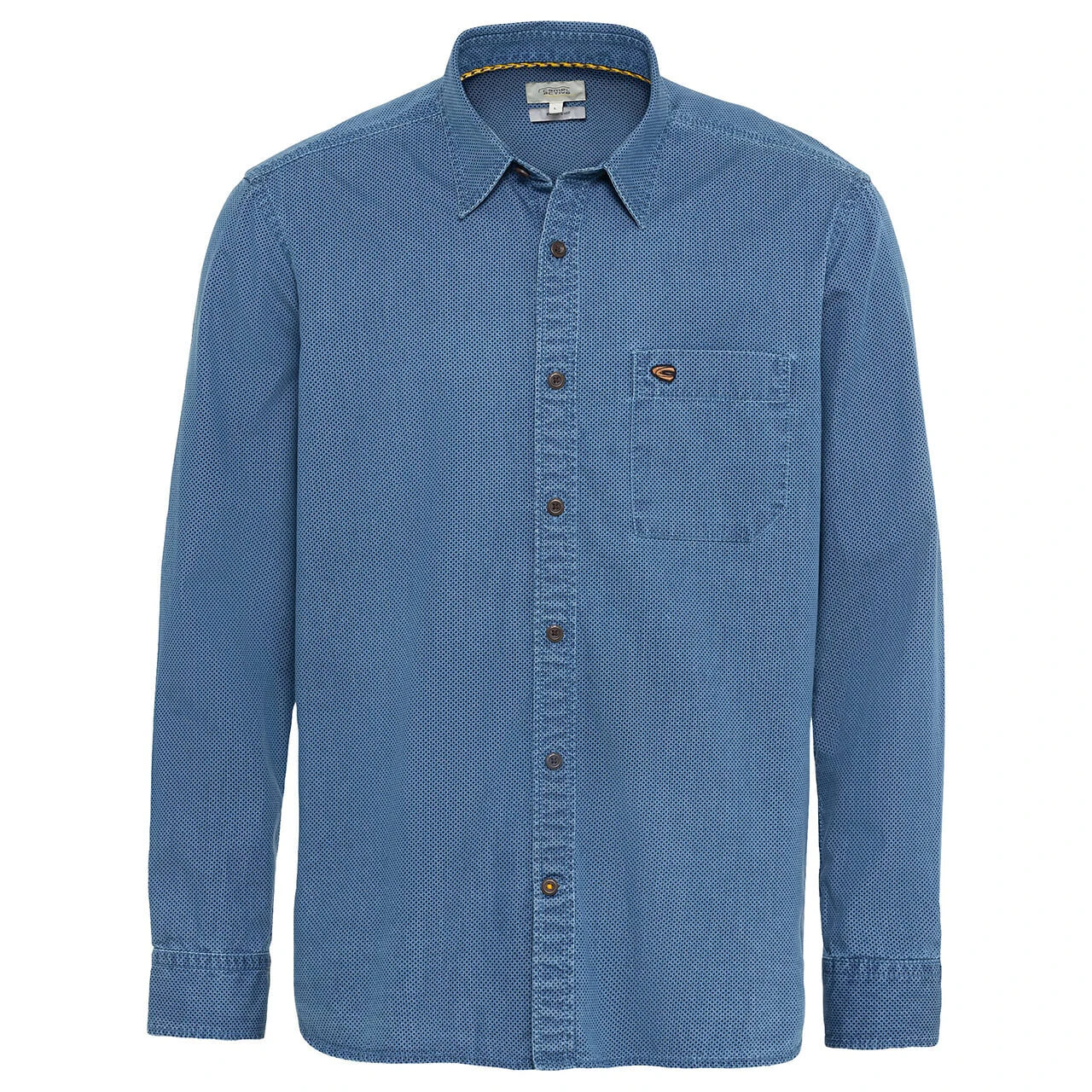 Um das schlichte Blau aufzupeppen, kombiniert das Camel active Herrenhemd einen tonalen Alloverprint dazu. Dunkle Knöpfe und ein gesticktes Logo an der Brusttasche bringen Brauntöne ein.