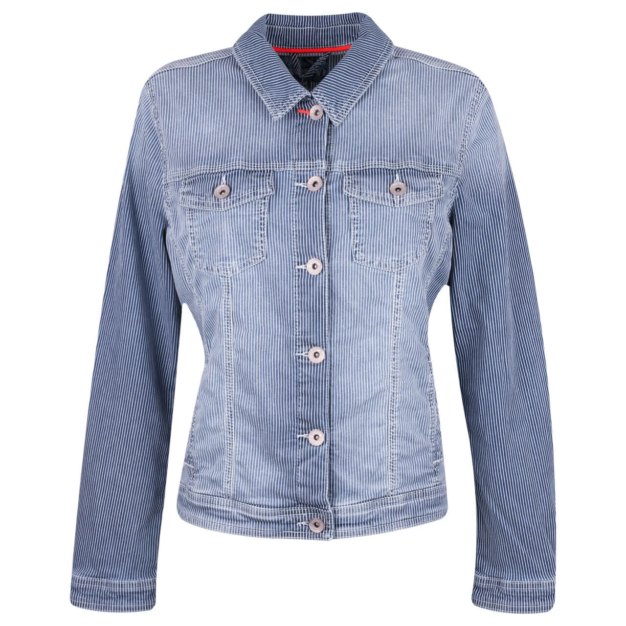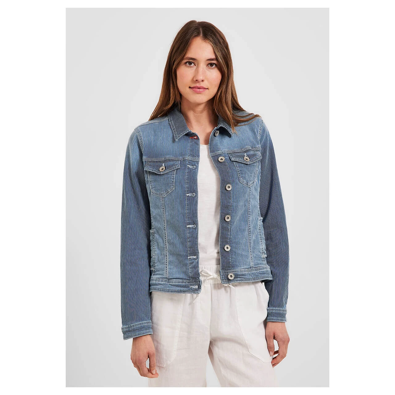 Der Streifenprint ist nicht nur für Oberteile und Jeans gemacht – auch die Cecil Damenjacke kann ihn ausgezeichnet tragen! Weißliche Knöpfe mit einer dezenten Used-Optik machen die Jeansjacke mit Kentkragen und Knopf an der Ärmelmanschette noch lässiger.