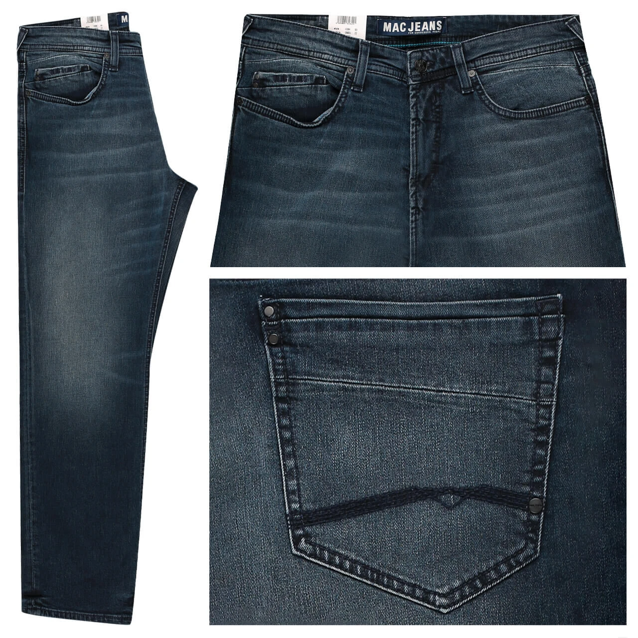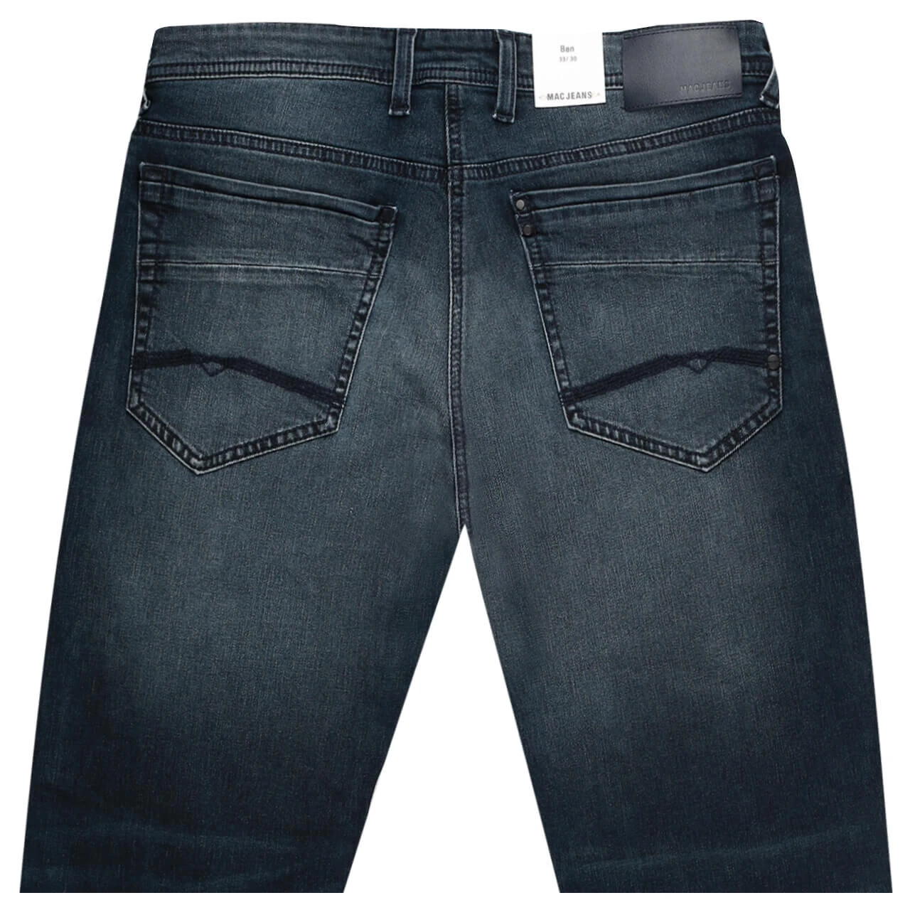 Die schrägen Gürtelschlaufen an der Hüfte sind eins der Markenzeichen der MAC Ben. Bei dieser Herrenjeans kommen zu den Charaktereigenschaften noch die blaue Waschung mit schwarzem Stich und die dekorativen Gesäßtaschen dazu.