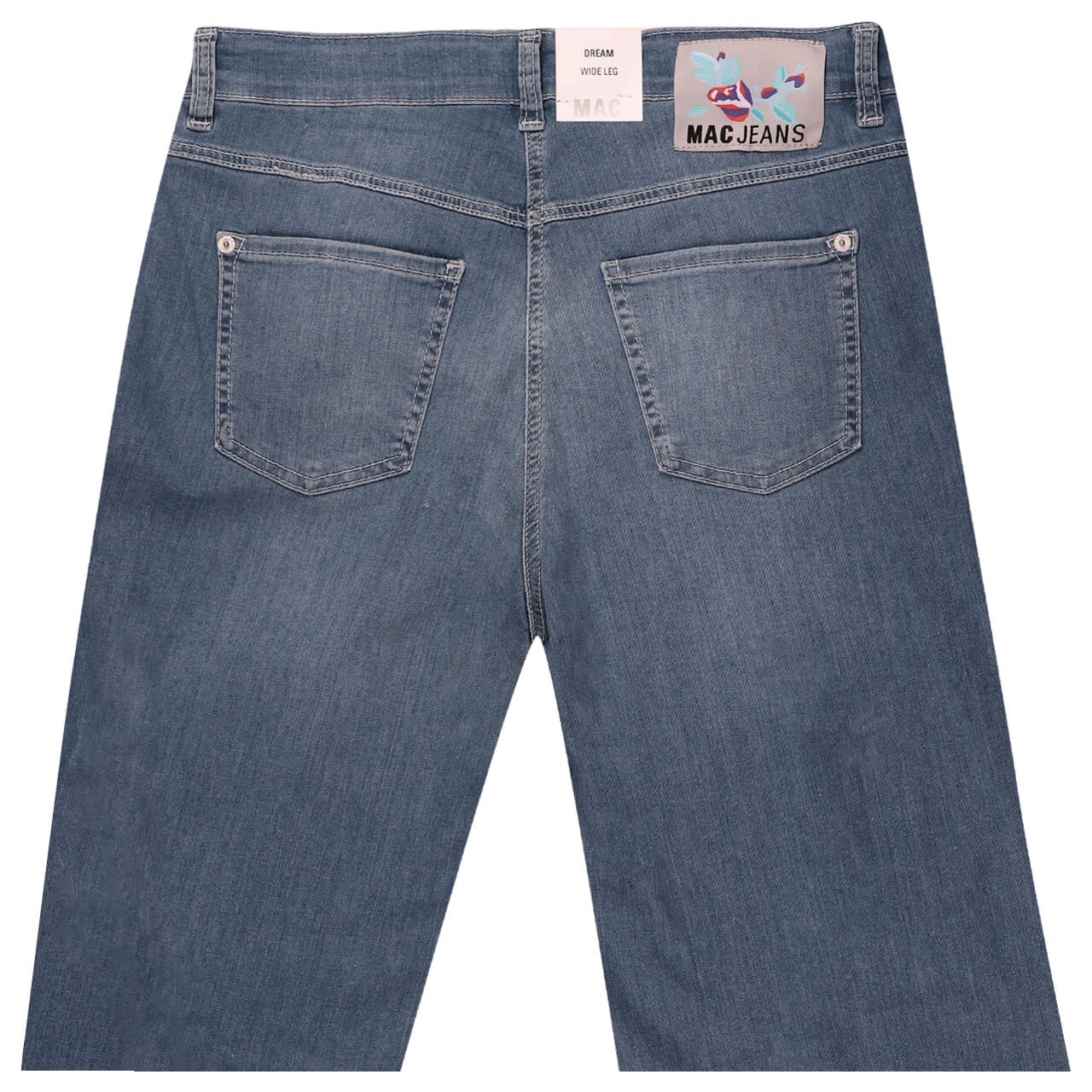 Blumige Aussichten bei der MAC Dream Wide! Die trendige Damenjeans mit Bundfalte auf dem weit geschnittenen Bein präsentiert eine Rose in kühlen Farben an ihrer Bundrückseite. Das Blau des Modells wirkt durch die leichte Waschung und die zartgrauen Nähte aufgehellt.
