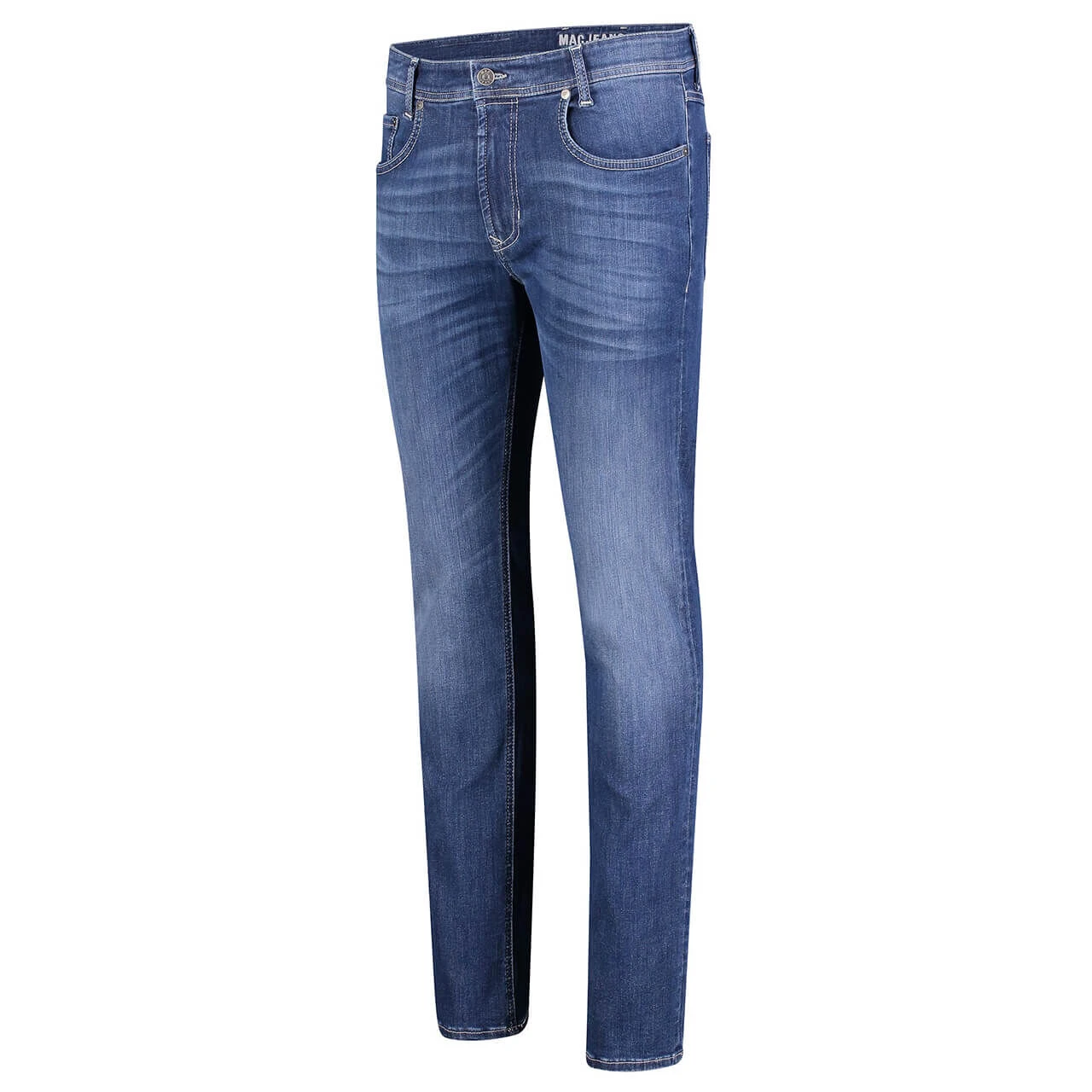 Die dezent verwaschene Optik und das Mittelblau verleihen dieser MAC einen frischen, modernen Look. Die Jeans zeichnet sich vor allem durch die hohe Elastizität aus, wobei der Stoff weder besonders dick, noch besonders dünn ist – insgesamt hat das Modell mit seinem Stretchanteil einen sehr angenehmen Tragekomfort. Eingearbeitete Sitzfalten auf den Oberschenkeln runden den Look der Modern-Fit-Jeans mit mittlerer Bundhöhe noch zusätzlich ab. Ein Lederpatch auf dem Hosenbund verrät das Label des Modells. Mit einem Herren Hemd in Blau- oder Grüntönen und einem maskulinen Ledergürtel entsteht ein lässiges Freizeitoutfit!