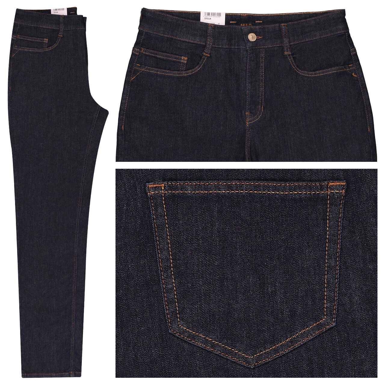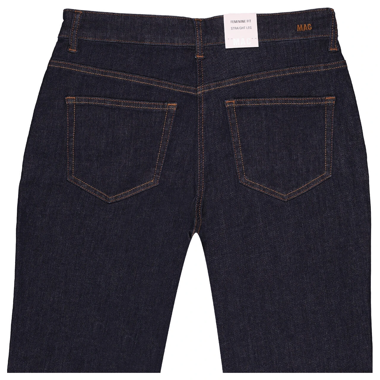Die MAC Stella spielt mit Kontrasten: Auf dem dunklen Denim heben sich zweifarbig-braune Nähte hervor. Der goldfarbene Knopf veredelt den Look der dunklen Basicjeans.