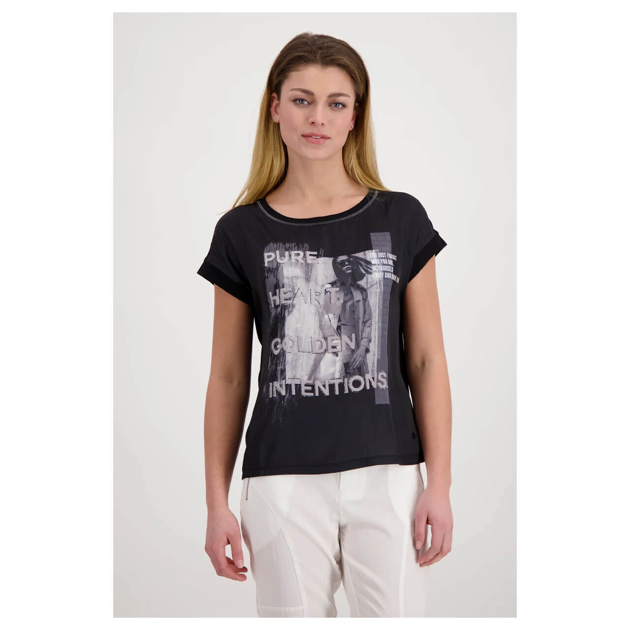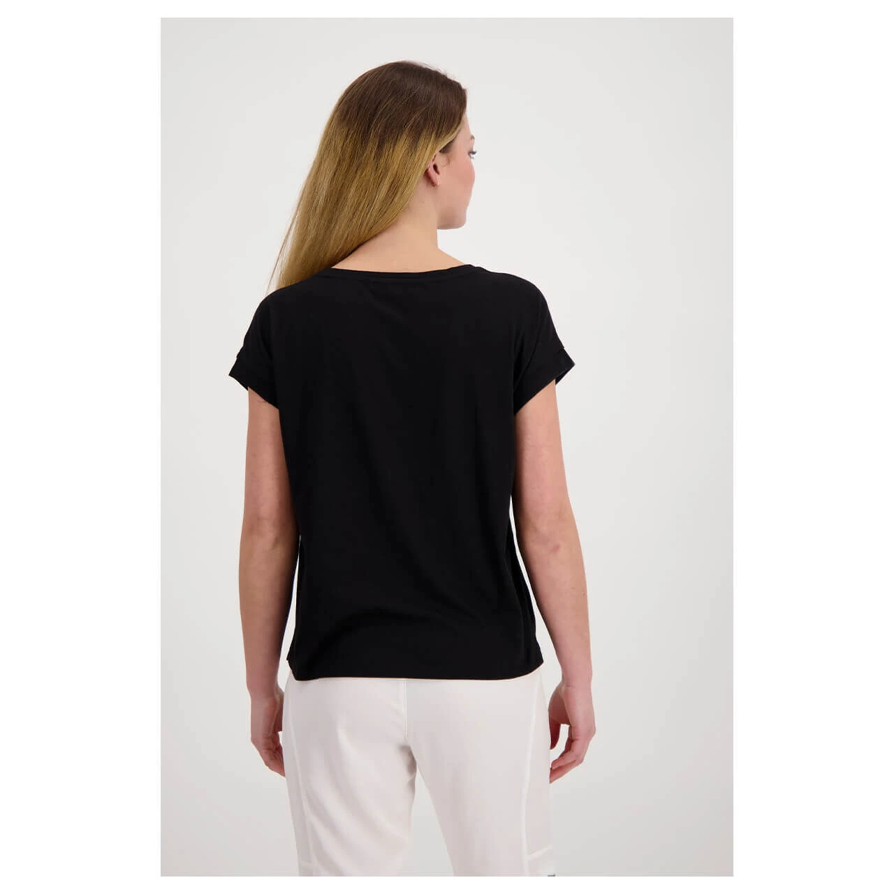 In einem sehr soften Material überzeugt das Monari Damen T-Shirt. Der mit schimmerndem Garn besetzte Kragen und der abgesetzte Ärmelsaum ergänzen den lässigen Print perfekt.