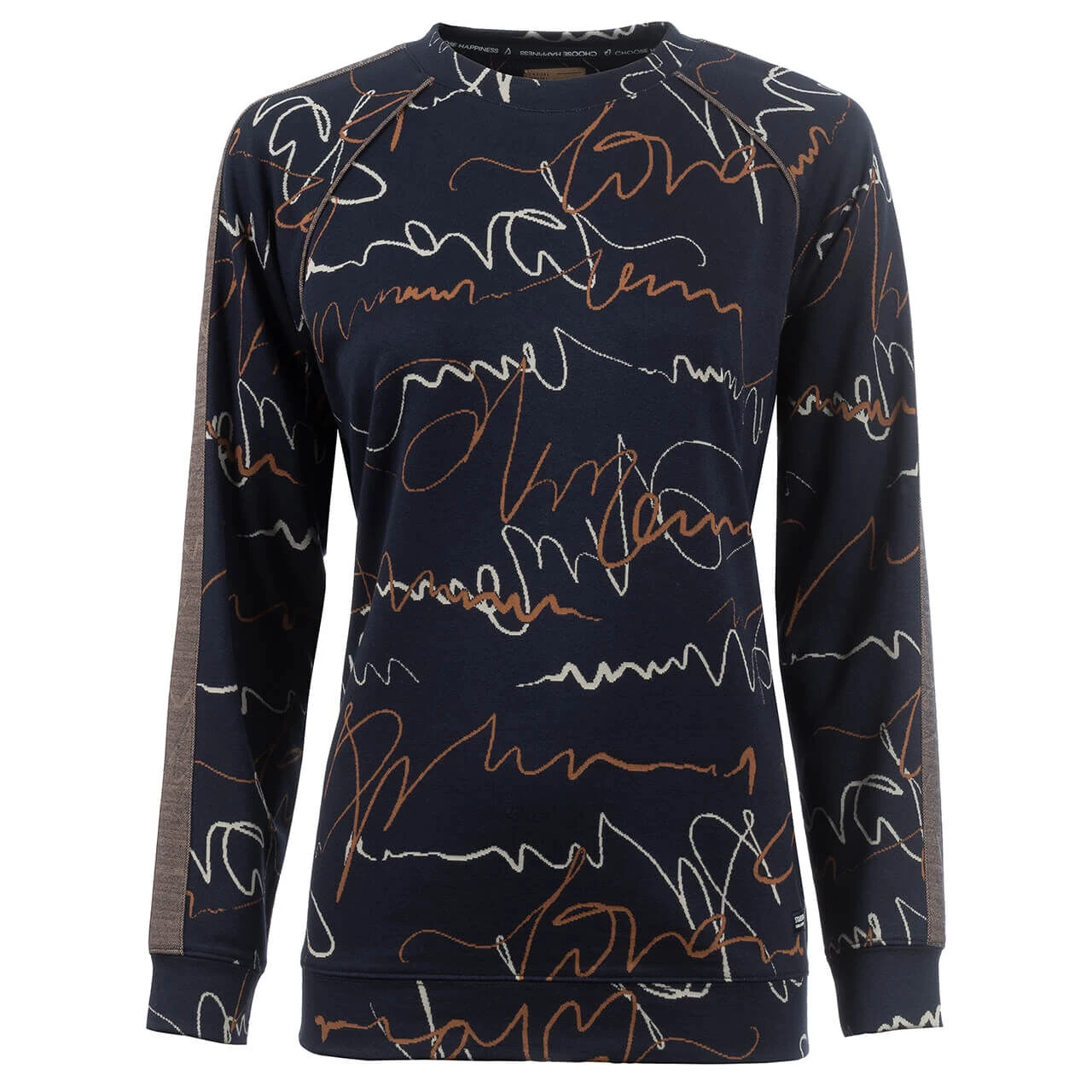 Bei dem Soquesto Damen Sweatshirt müssen Sie gar nicht erst versuchen, ein Wording zu erkennen – das langärmelige Modell hat einen abstrakten Fantasieprint. Ein brauner Streifen auf den Armen schafft einen sportlichen Look!