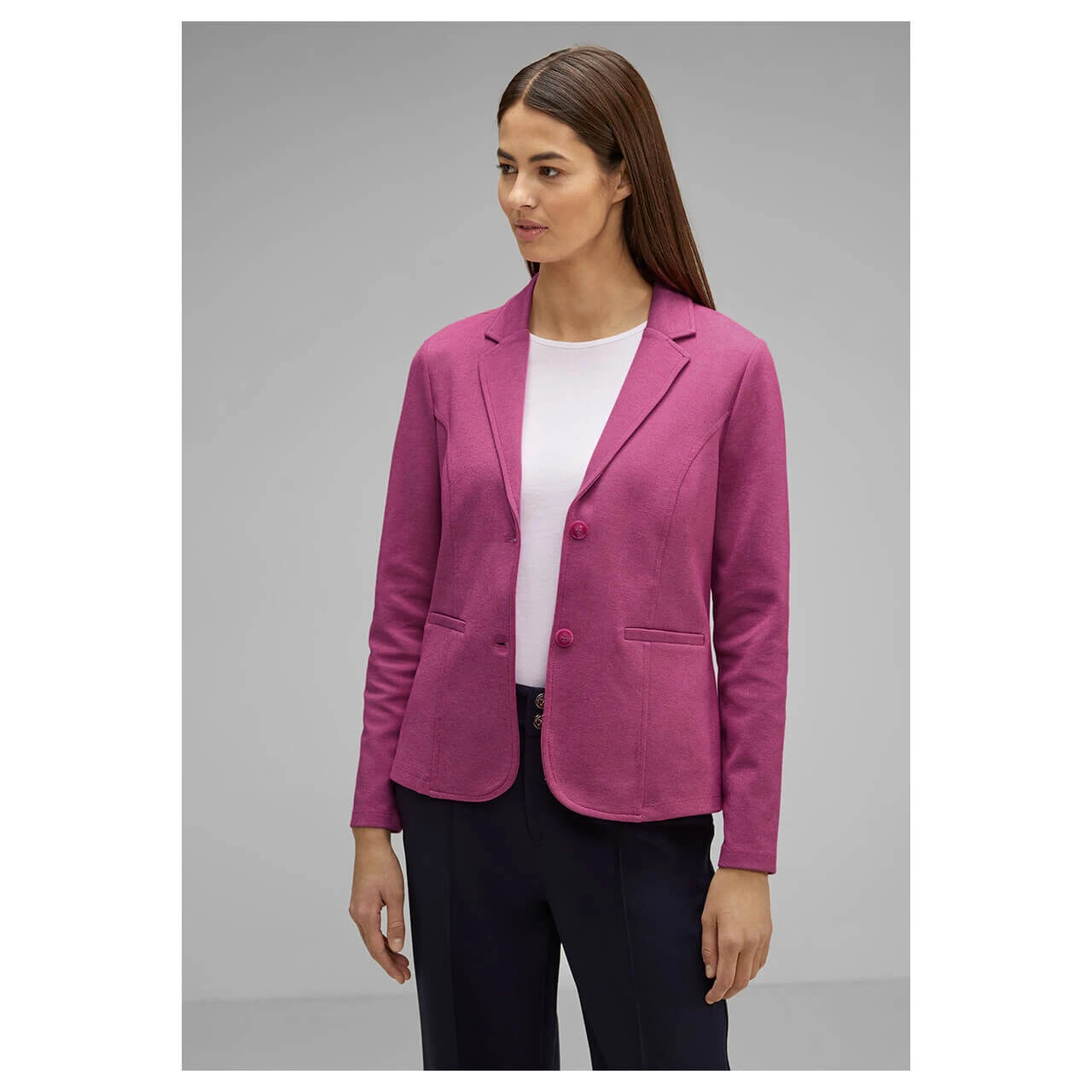 Besonders feminin wird es mit dem Damen Blazer von Street One in einem satten Beerenton. Die leichte Melierung verleiht Ihrem Outfit eine verträumte Note und ist somit ein absolutes Must-have in Ihrer Garderobe.