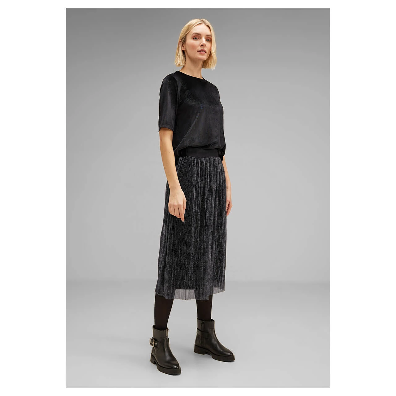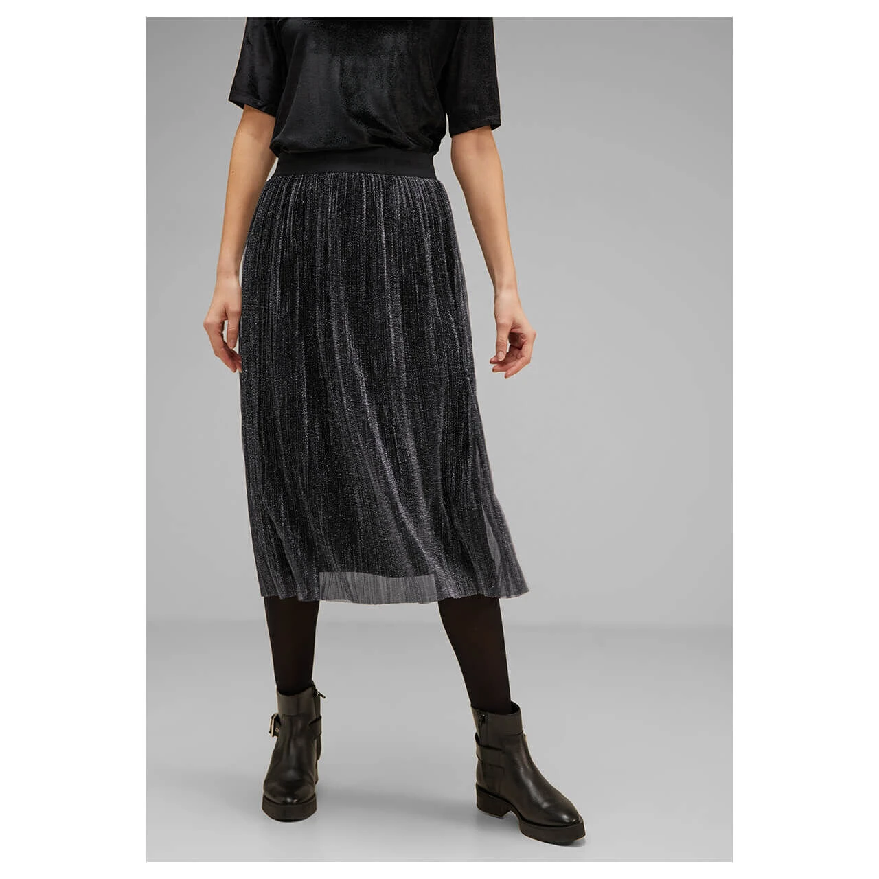 Großer Auftritt garantiert! In diesem Rock von Street One im Plissée-Stil mit Glitzerfäden werden Sie zum Blickfang jeder glamourösen Veranstaltung. Der Gummibund mit gleichfarbigem Wording verleiht dem edlen Damenrock zudem eine dezent sportive Note und sorgt nebenbei für ein gutes Tragegefühl.