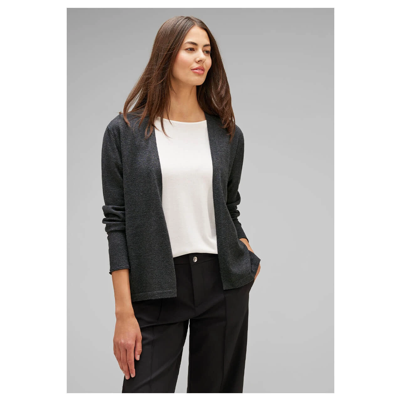 Unkompliziert und vielseitig einsetzbar! Die Street One Damenjacke ist aus einem weichen Materialmix gefertigt und überzeugt durch ihre einfache Eleganz. Schnell übergezogen, vervollständigt der unifarbene Kurz-Cardigan mühelos Ihr Outfit. Ein praktisches Kleidungsstück, das sowohl im Büro als auch in der Freizeit gut aussieht.