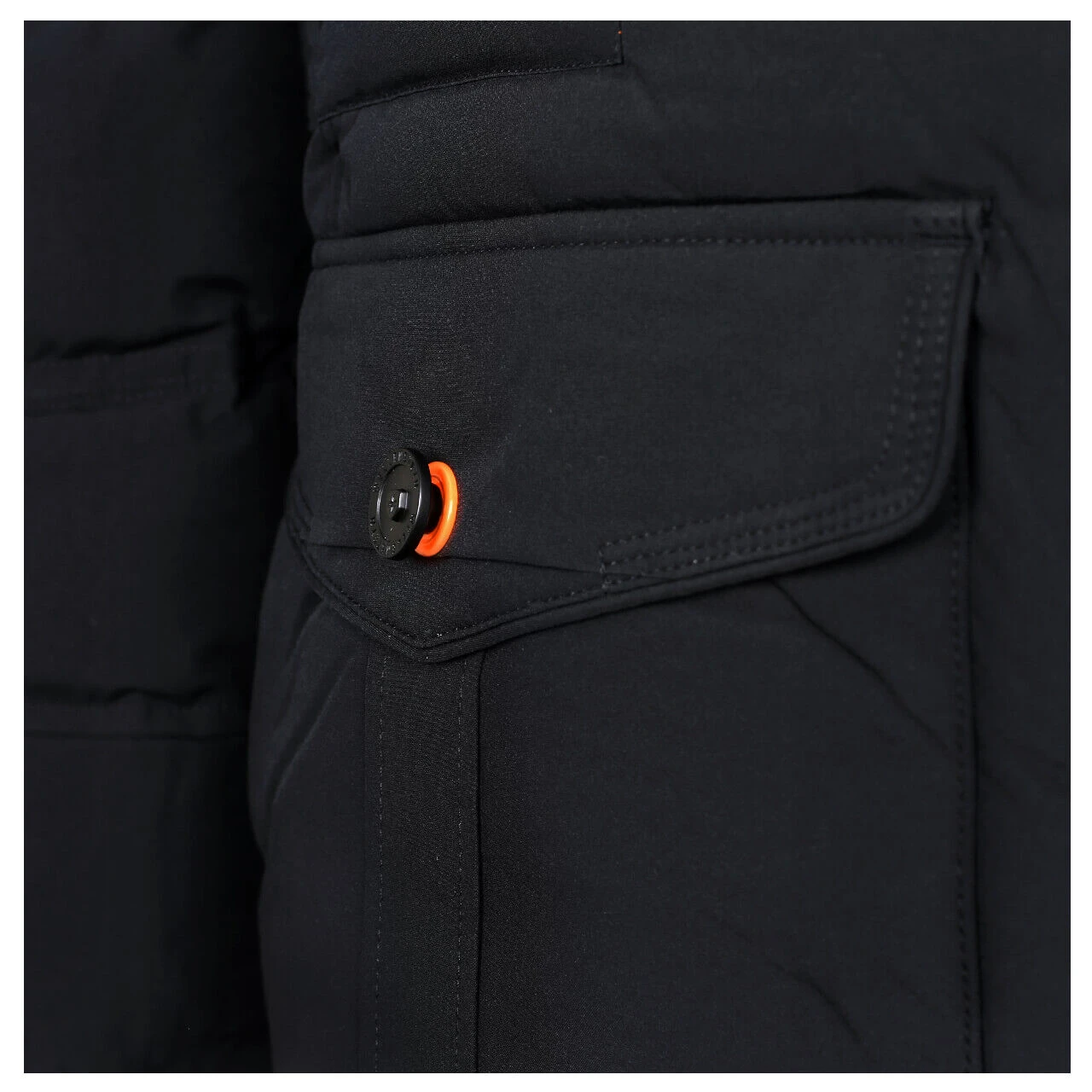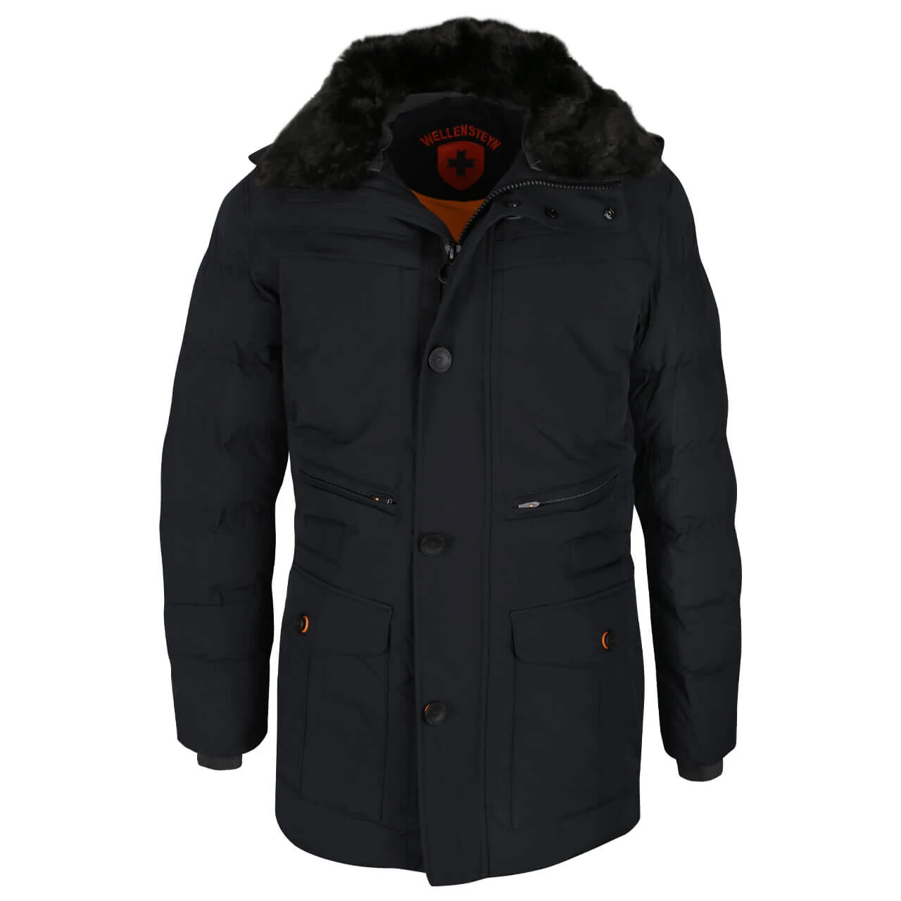 Die Wellensteyn Casino überzeugt nicht nur mit ihrer zeitlosen Optik, sondern auch mit ihrem besonders leichten Gewicht im Vergleich zu anderen Winterjacken. Die Kapuze kann abgenommen oder ganz nach Belieben verstellt werden. Der ebenfalls abnehmbare Kragen ist dabei nicht nur mit modisch-schwarzem Fell geschmückt, sondern wirkt durch einen markentypischen Print auf der Rückseite und die graue Färbung besonders modern. Außerdem ist die Herrenjacke knitterunempfindlich und schmutzabweisend. Diese Eigenschaften machen das Modell zu einem echten Allrounder, der sich optimal für diverse Lebenslagen eignet. Die zwei Eingrifftaschen und die beiden Zippertaschen bieten gemeinsam mit den beiden Innentaschen genug Stauraum für kleine Alltagsbegleiter. Zusätzlich versteckt sich noch eine Zippertasche entlang des praktischen Zwei-Wege-Reißverschlusses. Durch kleine Schlaufen, die mit Druckknöpfen befestigt werden, kann die Jacke ganz nach Belieben noch etwas enger gestellt werden. Rippbündchen an den Ärmelenden vermeiden das Eindringen von kalter Luft. In Kombination mit einer stretchigen Jeans und einem Pullover entsteht ein bequemes Kalt-Wetter-Outfit.