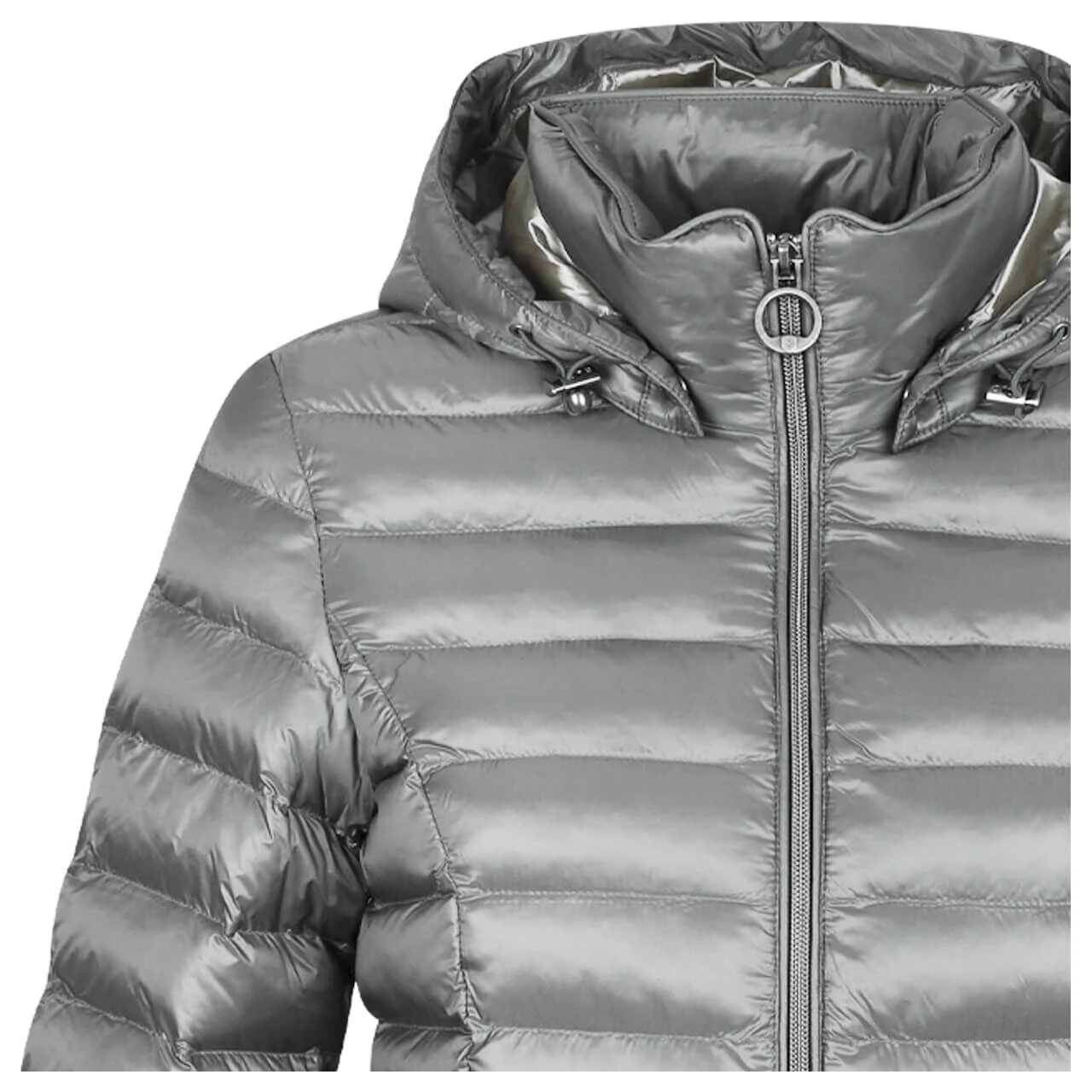Mit der Wellensteyn Italy Hood legen Sie einen glamourösen Auftritt hin! Das Modell überzeugt mit einem schimmernden Metallic-Effekt in einem silbernen Grauton. Ein extrem weicher Griff macht die Übergangsjacke mit modischem Steppmuster zu einem optimalen Begleiter an tristen Tagen. Das federleichte Material sorgt zusätzlich für einen angenehmen Komfort. Zwei Außentaschen und eine Innentasche bieten Ihnen genügend Stauraum für kleine Utensilien. Der Stehkragen und die abnehmbare Kapuze mit Tunnelzugband bieten Ihnen zusammen mit der windabweisenden Funktion weitere Vorteile. Kombinieren Sie zu der Damenjacke eine dunkle Damenjeans und lassen Sie die Italy Hood für sich glänzen.