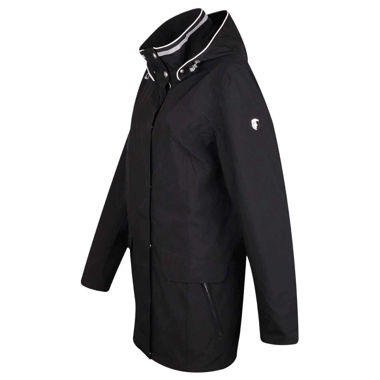 Schlichte Eleganz spiegelt die Wellensteyn Damenjacke Modena wider. Die wind- und wasserdichte Funktionsjacke punktet mit ihrem langen Schnitt und der schwarzen Farbe. Davon heben sich weiße Paspeln ab – zum Beispiel an der abnehmbaren, größenverstellbaren Kapuze. Auch der Reflektorstreifen am Stehkragen bildet einen kleinen Kontrast. Vier Hüfttaschen – zwei mit Zipper, zwei mit Klappe und Druckknopf – sowie zwei Innentaschen kümmern sich um die Funktionalität bei der atmungsaktiven Damen Übergangsjacke. Den Zwei-Wege-Reißverschluss schützt eine zusätzliche Blende. Den Saum der Modena können Sie mit einem innenliegenden Tunnelzug enger stellen.